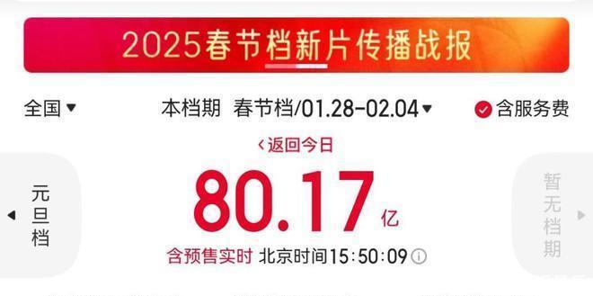 发布日期:2025-02-05 08:24 点击次数:164大皖新闻讯 据猫眼电影专业版数据,截至2月3日下午15时37分,2025年春节档(1月28日至2月4日)电影市场总票房突破80亿元(含预售),稍晚时候约15时50分,档期票房达到80.17亿元(含预售),反超此前票房最高的2024年中国影史春节档(80.16亿)。